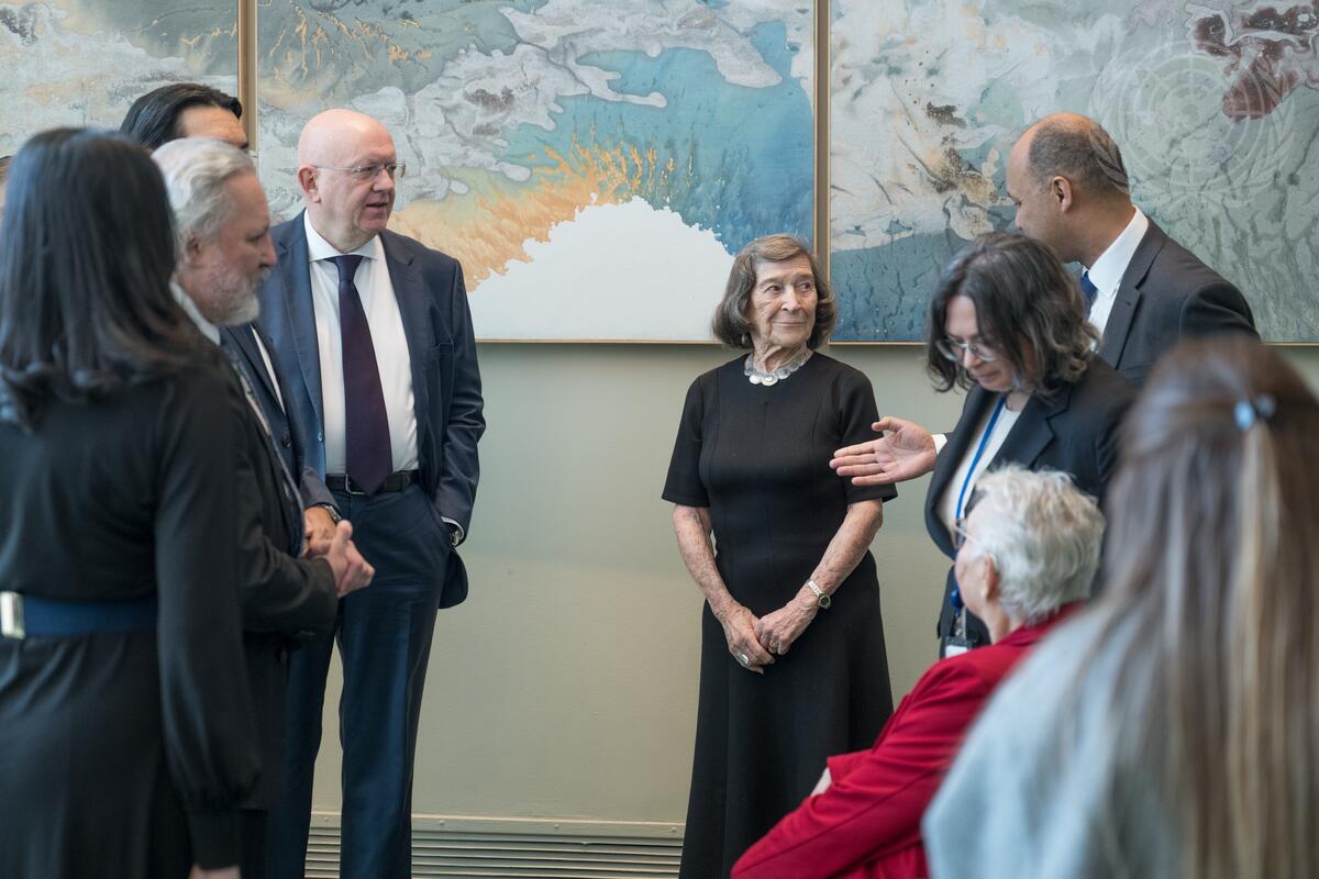 James Kariuki (fourth from right), Acting Permanent Representative of the United Kingdom to the United Nations and President of the Security Council for the month of February, speaks with Evelyn Konrad (centre), Holocaust survivor, during a group photo at UN Headquarters. At fourth from left is Vassily Nebenzia, Permanent Representative of the Russian Federation to the United Nations.