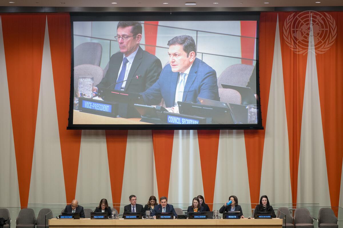 Paruyr Hovhannisyan (right on screen), Permanent Representative of the Republic of Armenia to the United Nations and Vice-President of the Economic and Social Council (ECOSOC), addresses the Economic and Social Council Coordination Segment: 2026 session titled "Transformative, equitable, innovative and coordinated actions for the 2030 Agenda and its SDGs for a sustainable future for all".