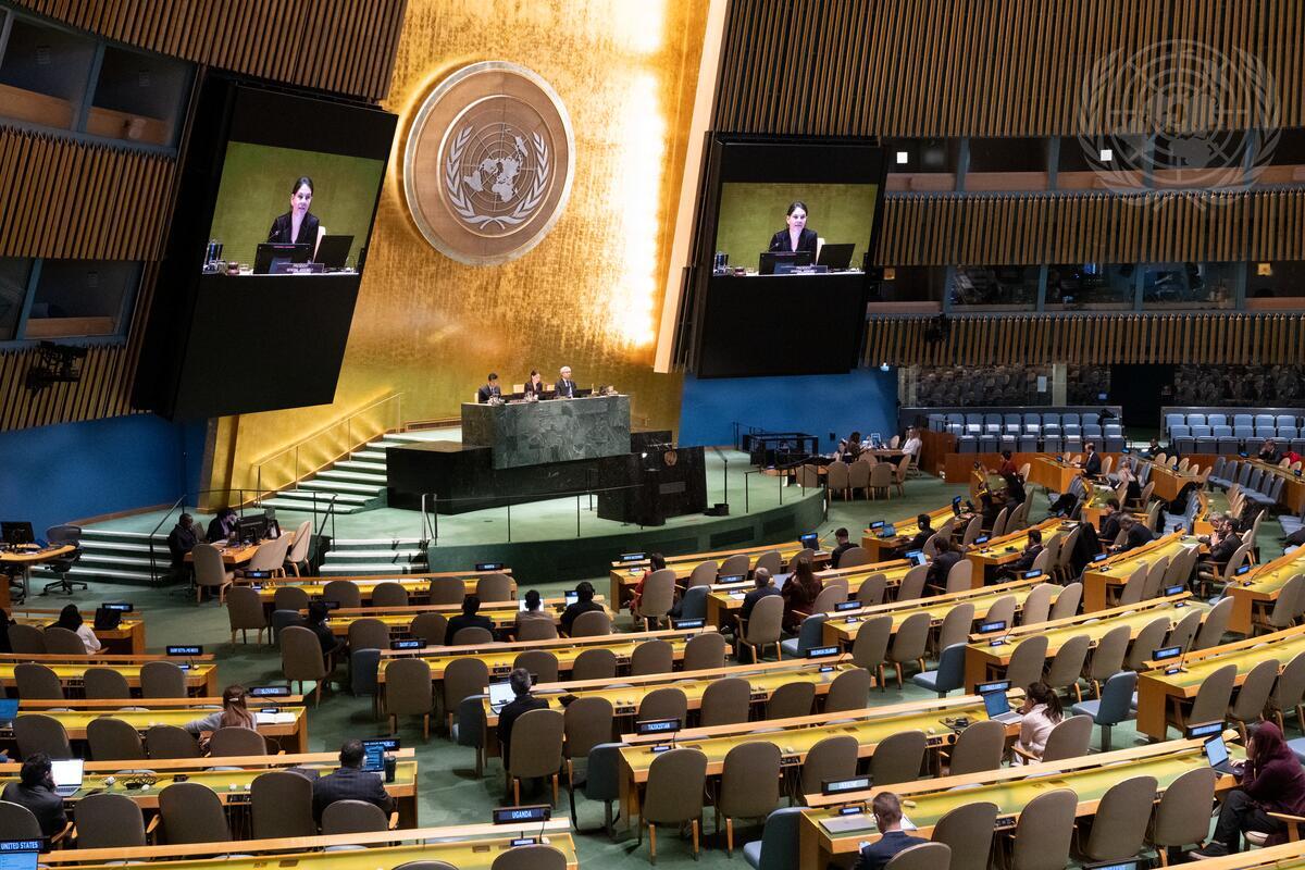Annalena Baerbock (on screens and centre at dais), President of the eightieth session of the United Nations General Assembly, chairs the 71st plenary meeting of the General Assembly on "Sport for development and peace: building a peaceful and better world through sport and the Olympic ideal".