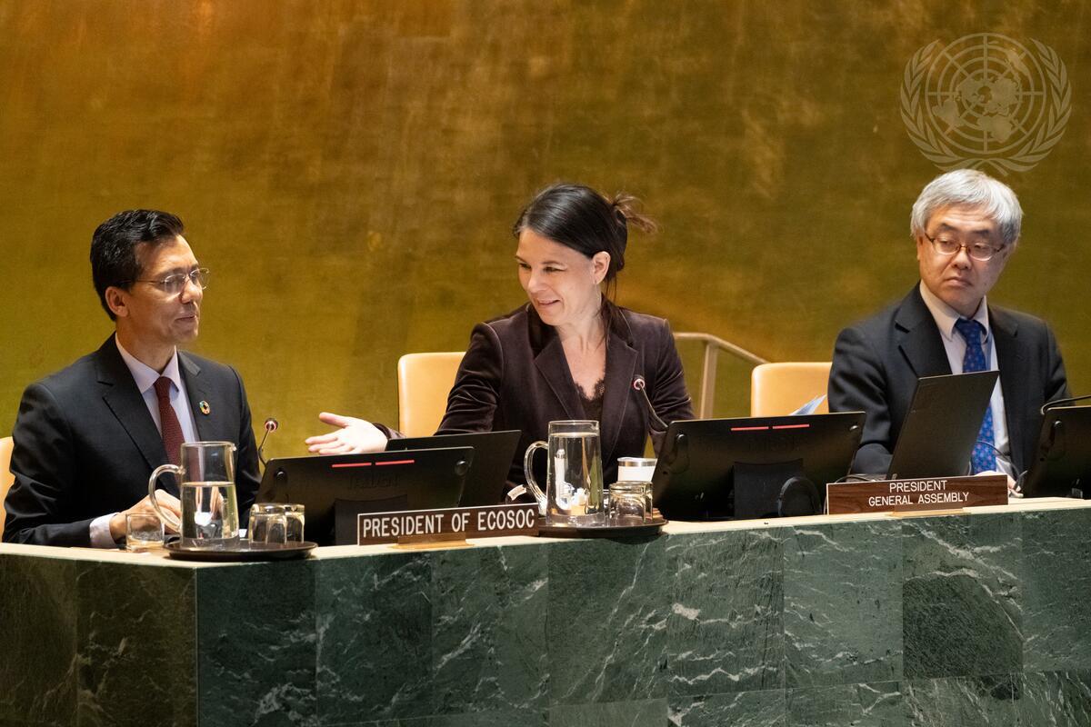 Annalena Baerbock (centre), President of the eightieth session of the United Nations General Assembly, chairs the 71st plenary meeting of the General Assembly on "Sport for development and peace: building a peaceful and better world through sport and the Olympic ideal". At left is Lok Bahadur Thapa, Permanent Representative of Nepal to the UN and President of the Economic and Social Council (ECOSOC), and at right is Kenji Nakano, Chief of the General Assembly Affairs Branch, Department for General Assembly and Conference Management (DGACM).