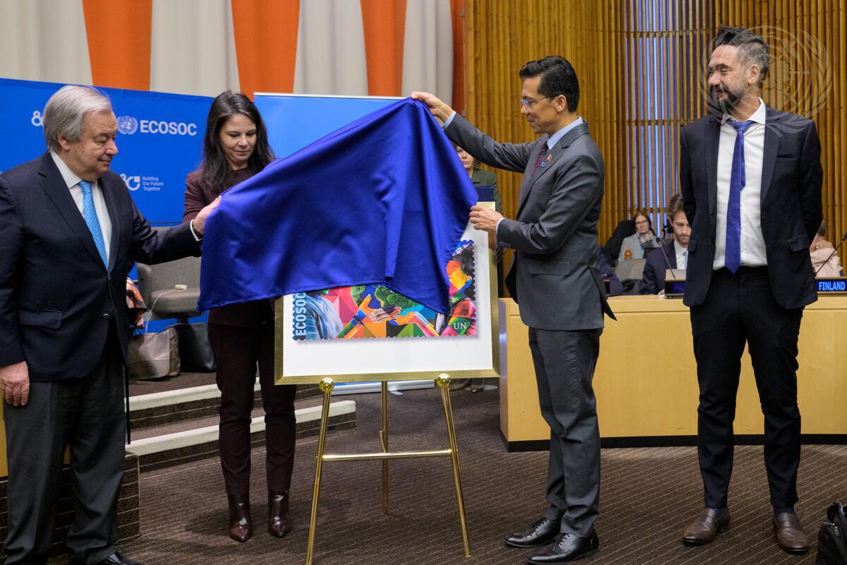 Secretary-General António Guterres (left); Annalena Baerbock (centre left), President of the eightieth session of the United Nations General Assembly; and Lok Bahadur Thapa (centre right), Permanent Representative of Nepal to the UN and President of ECOSOC, unveil a stamp with a motive of the mural painted by artist Eduardo Kobra (right) during the special meeting on the commemoration of the eightieth anniversary of the Economic and Social Council entitled “ECOSOC80: A Turning Point for Multilateralism”.