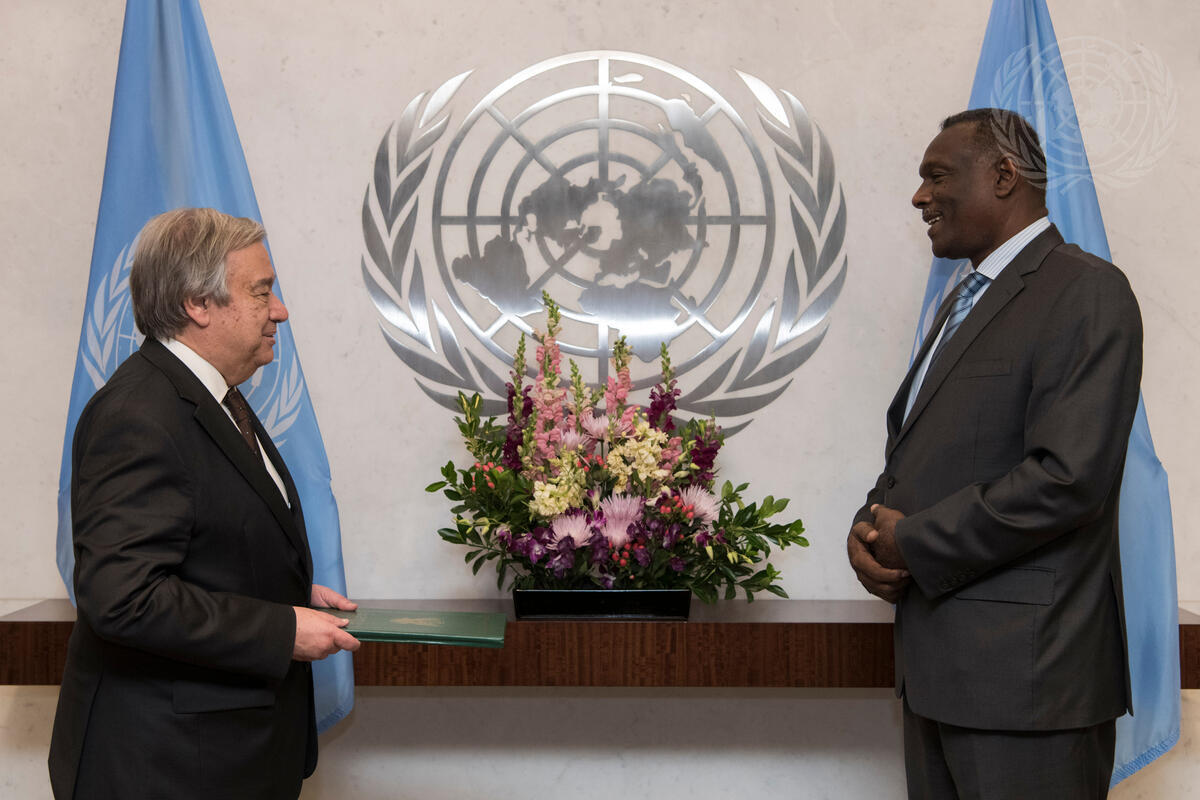 Omer Mohamed Ahmed Siddig (right), Permanent Representative of the Republic of the Sudan to the United Nations, presents his credentials to Secretary-General António Guterres.