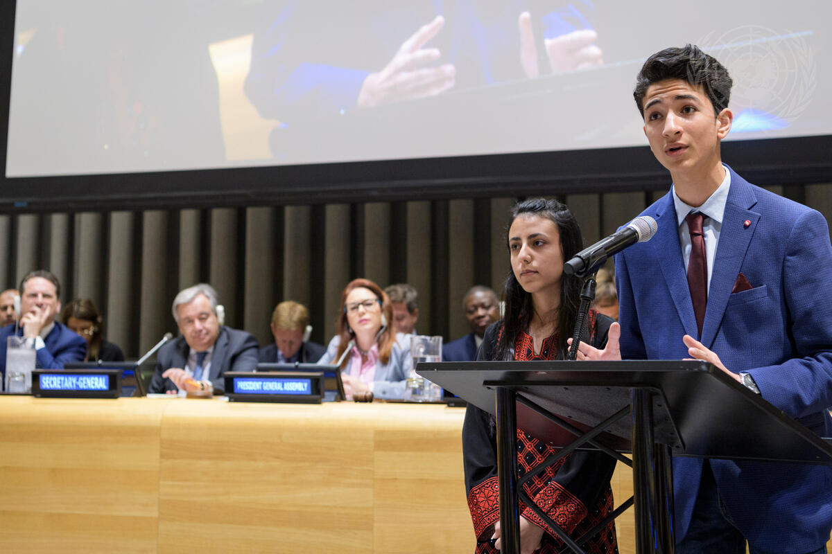 Hatem Hamdouna (right, at podium) and Hanan Abu Sabeh, Student Parliamentarians at UNRWA, made remarks during the meeting, voicing appeals to those in attendance.