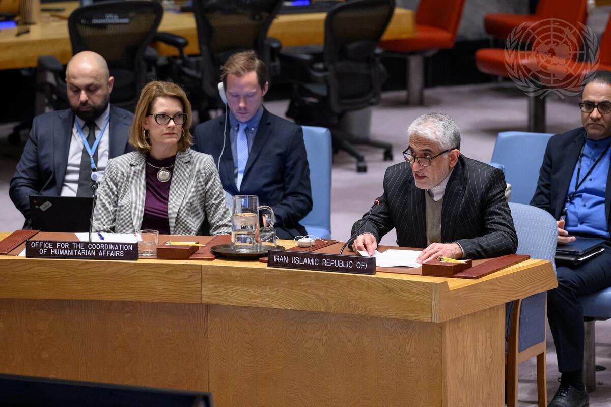 Amir Saeid Iravani (right at table), Permanent Representative of the Islamic Republic of Iran to the United Nations, addresses the Security Council meeting on the situation in the Middle East (Syria). At left is Lisa Doughten, Director of Financing and Outreach Division, Office of the Coordination of Humanitarian Affairs (OCHA).