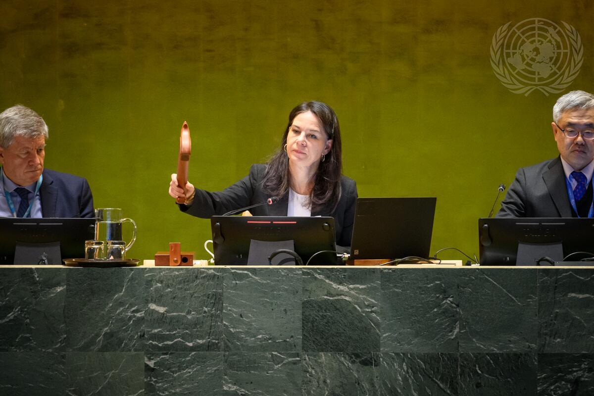 Annalena Baerbock (centre), President of the 80th Session of the General Assembly, chairs the 48th plenary meeting of the General Assembly on crime prevention and criminal justice. The meeting focused on the appraisal of the United Nations Global Plan of Action to Combat Trafficking in Persons. At left is Guy Ryder, Under-Secretary-General for Policy, and at right is Kenji Nakano, Chief of the General Assembly Affairs Branch, Department for General Assembly and Conference Management (DGACM).