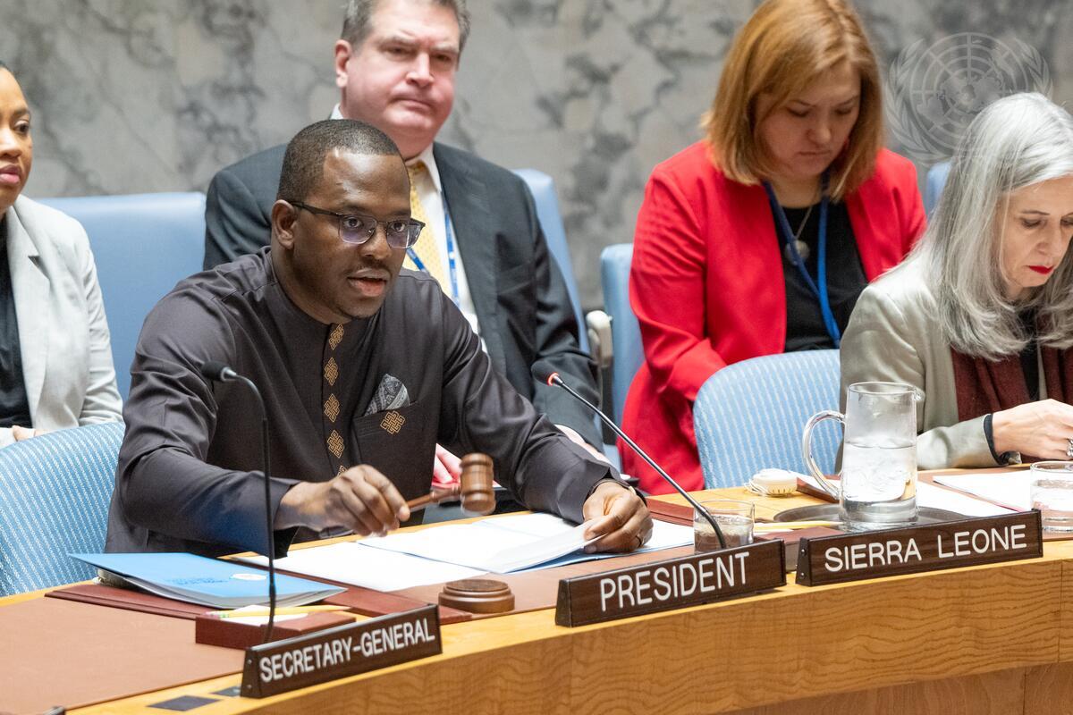 Michael Imran Kanu (left), Permanent Representative of Sierra Leone to the UN and President of the Security Council for the month of November, chairs the Security Council meeting on the situation in the Middle East, including the Palestinian question.