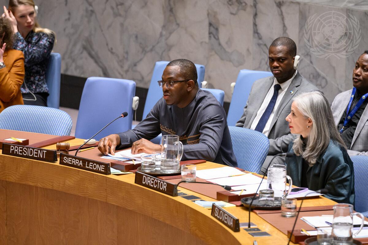 Michael Imran Kanu (left at table), Permanent Representative of Sierra Leone to the UN and President of the Security Council for the month of November, chairs the Security Council meeting on maintenance of peace and security of Ukraine. At right is Claudia Banz, Director of the Security Council Affairs Division of the Department of Political and Peacebuilding Affairs (DPPA).