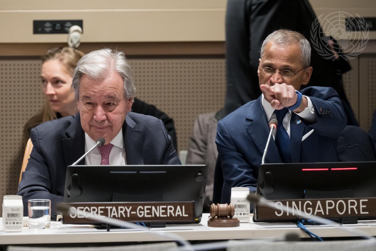 UN Secretary-General António Guterres (left) is seen attending the informal dialogue with the Forum of Small States (FOSS). On the right is Burhan Gafoor, Permanent Representative of Singapore to the United Nations.