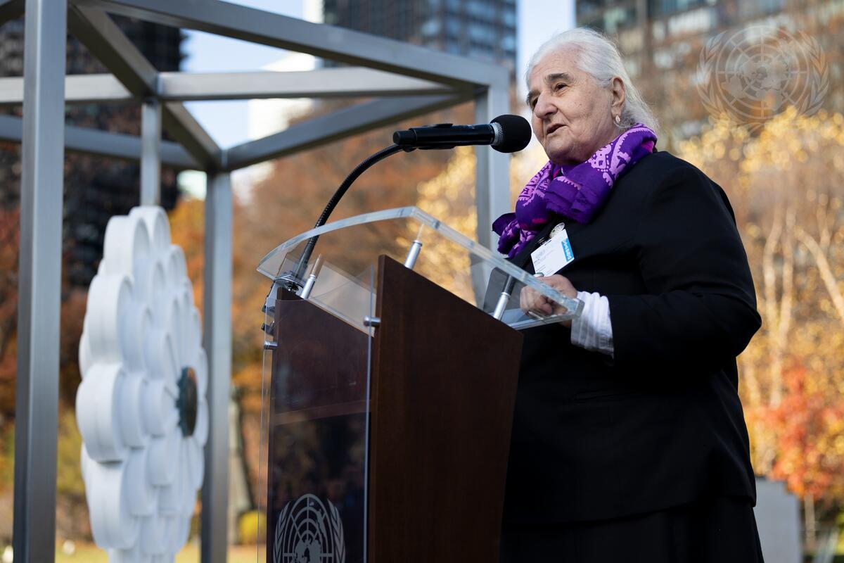 Munira Subašić, President of the Association of Mothers of Srebrenica and Zepa, addresses the dedication of the "Flower of Srebrenica" Memorial honoring the victims of the 1995 genocide in Srebrenica. Twenty-two members of Munira Subašić's immediate family were killed in the genocide, including her husband and her youngest son. The memorial is located in the garden at UN Headquarters.