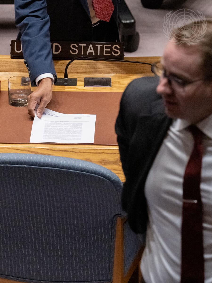 The draft resolution is handed out ahead of the vote during the Security Council meeting on the situation in the Middle East, including the Palestinian question